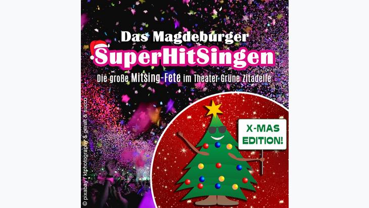 Wir feiern zusammen Weihnachten und unser Theaterchen lädt zu einem großen Karaoke-Konzert, bei dem der ganze Saal mitsingen wird, ein. Bei der Xmas-Edition unserer Gruppen-Karaoke präsentieren wir neben Songs, die man das ganze Jahr über hört, einen abwechslungsreichen Mix aus weihnachtlichen Hits mit klassischen Weihnachtsliedern und stimmungsvollen Xmas-Evergreens – „Das Magdeburger SuperHitSingen“ hat alles, was es im Rock, -Pop, -Schlager und natürlich auch im Radio zu Hören gibt.